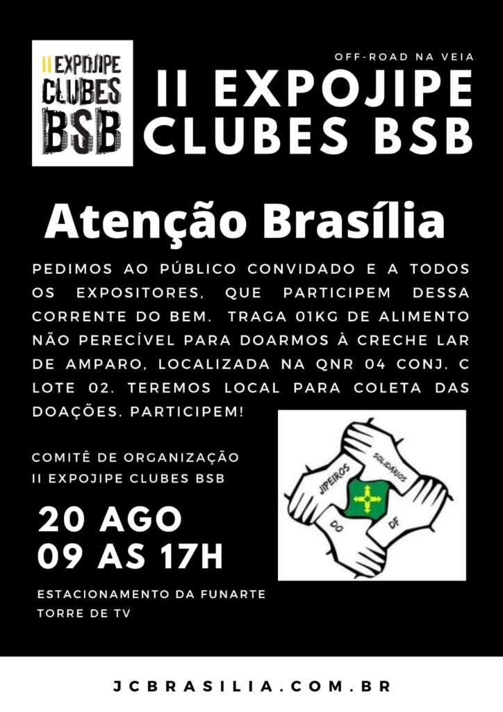 O Jipe Clube de Brasília vai está expondo um pouco sobre suas Ações Sociais como uma mega atividade realizada na Chapada dos Veadeiros, quando as fortes chuvas deixaram centenas de Comunidades ilhadas, sem alimento e água potável. Em Parceria com outro Clube, A Trilha da Inclusão é um passeio off-road onde os zequinhas são pessoas com algum tipo de deficiência. A ideia é promover um evento com adaptações para que PcD possam desfrutar do esporte off-road no Distrito Federal. Este ano, estamos trazendo um novo Parceiro, a Saga Jeep